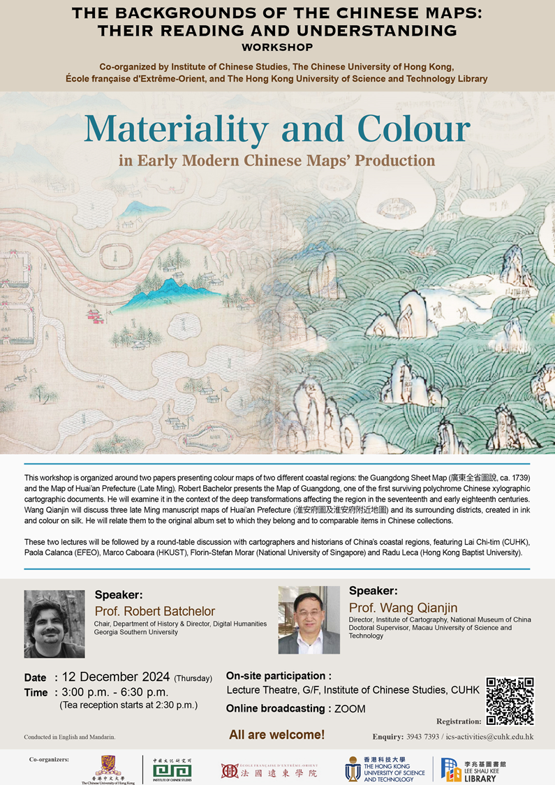 You are cordially invited to attend the "The Backgrounds of The Chinese Maps: Their Reading and Understanding Workshop - Materiality and Colour in Early Modern Chinese Maps’ Production co-organized by Institute of Chinese Studies, The Chinese University of Hong Kong, École française d'Extrême-Orient, and The Hong Kong University of Science and Technology Library. The lecture will be in English and Mandarin and conducted in hybrid mode from 3:00 p.m. – 6:30 p.m. on 12 December 2024 (Thursday) at Lecture Theatre, G/F, Institute Studies, CUHK.